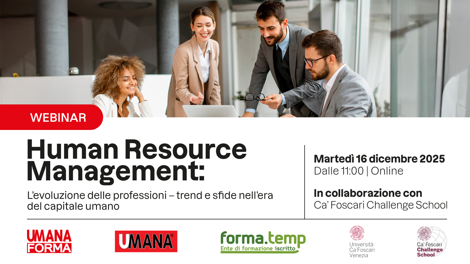 Seguirà la presentazione del corso gratuito post-graduate People Management, promosso da UMANA SPA e realizzato da Umana Forma in collaborazione con Ca’ Foscari Challenge School, finalizzato alla creazione di profili professionali capaci di coordinare e gestire i processi HR.